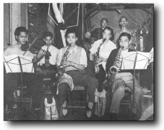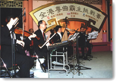 粵劇樂隊,行內稱為「棚面」。清朝光緒以前,基本是沿襲「外江班」時期的樂隊體制。最早的樂器有二弦、竹殼提琴、月琴、三弦、鼓竹敲擊等。由於這些古樂器的發音粗硬、聲音高吭,所以也稱為「硬弓組合」。清末民初,樂隊人數日漸增多,增加到「十手」,所謂「手」,大概是「人手」的意思。(註9) 二十年代,粵劇樂隊開始使用西洋樂器,最初是以整組西洋樂器代替樂隊的弦樂、管樂部分,所以稱為「西樂部」。「西樂部」的樂器 包括:小提琴、木琴、夏威夷結他、色士風(saxphone)、班卓琴(banjo)等,甚至爵士鼓、鋼琴都曾在粵劇樂隊中出現過。 不過,這種樂隊組合缺乏地方特色,也缺乏戲曲味道。慢慢地,粵劇樂隊又引入一些中國樂器,例如:高胡、中胡、琵琶等,同時保留小提琴、色士風等西洋樂器,成為中西結合的樂隊。(註10及11) 為配合不同戲場的要求,粵劇藝人將伴奏樂隊分成「硬弓組合」和「軟弓組合」兩種。 「硬弓組合」的主要樂器有二弦、竹殼提琴、喉管、三弦、月琴、橫簫(笛子)、文鑼鼓和高邊鑼鼓。領奏樂器是二絃,適宜伴奏威武、激昂的情節。但在伴奏「古腔粵曲」時,「硬弓組合」也會用來伴奏「文場戲」。